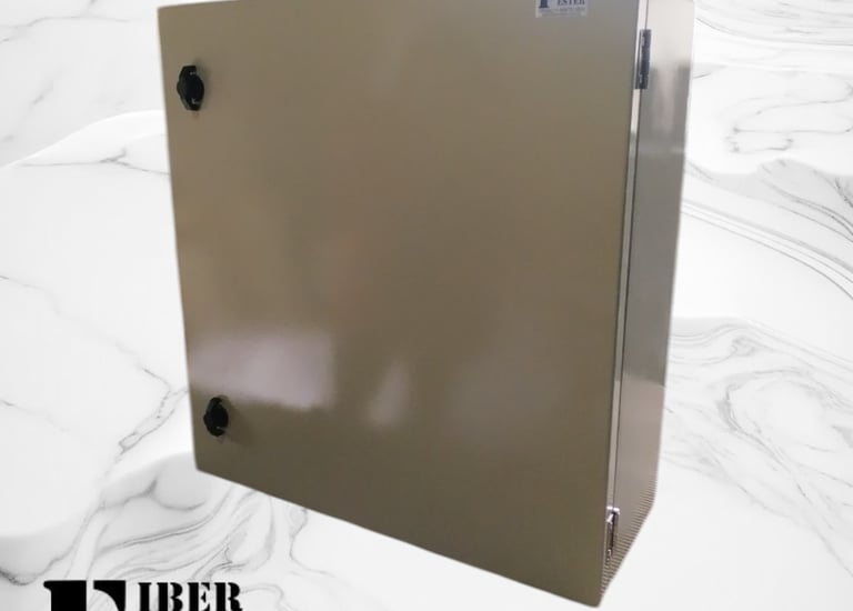 Componentes elétricos e eletrônicos protegidos em painéis de fibra de vidro resistentes e duráveis.